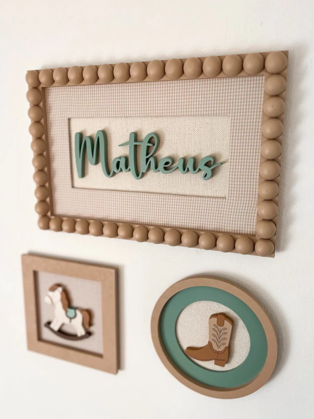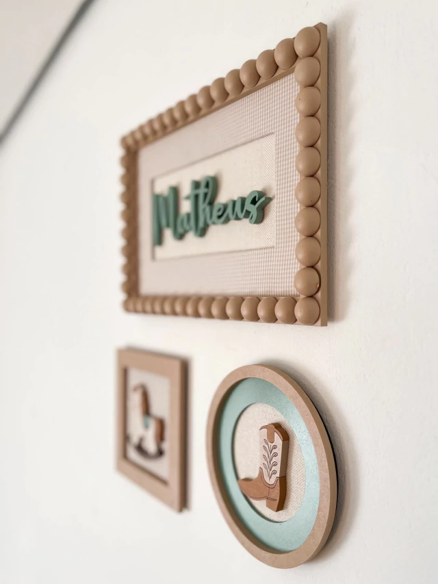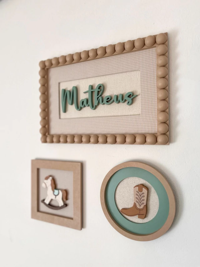> Fixação: o enfeite porta maternidade vai com um suporte na parte de trás, próprio para encaixar direto em um preguinho. Os quadros menores irão com dupla face atrás. Bem prático.