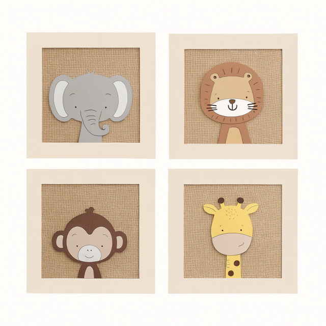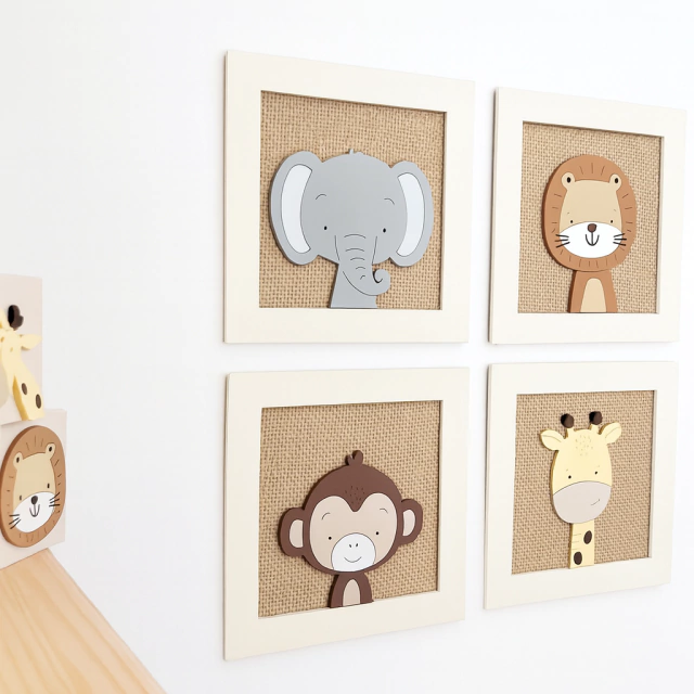 - O QUE ESTÁ INCLUSO: Conjunto de 4 quadrinhos infantis tema safári feitos em MDF de 6mm com fundo em tecido de juta, trazendo um toque natural e delicado para a decoração.